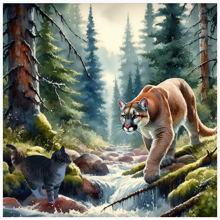 He gets too close for comfort, and I turn and start to run and before I even get to a tree he was already upon me. My body surges and overloads with spasm like energy that shoots from my paws through to my ears. I start to dematerialize and float above myself. Like a spark I quickly fall into a valley feeling heavy and dense. I land in my body existing but not knowing what to do. Waiting to come back online with my eyes closed I hear a low hum and then a whistle. I feel a vibration under my belly. This rumble shakes me into startled awareness. Focusing my eyes there is reason for alarm. A big metal cloud grows louder barreling down towards me.